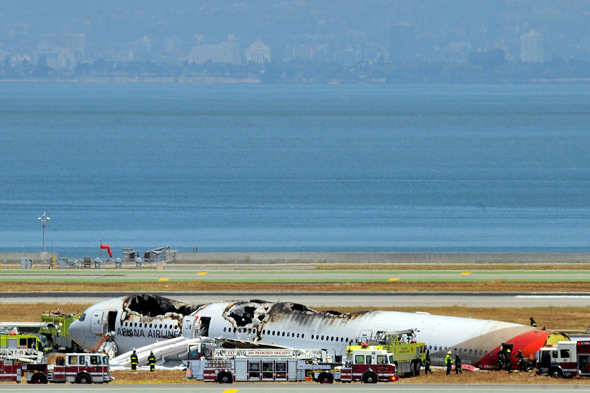 2013年7月6日,在美國(guó)舊金山國(guó)際機(jī)場(chǎng),救援人員在發(fā)生事故的波音777飛機(jī)旁工作。
