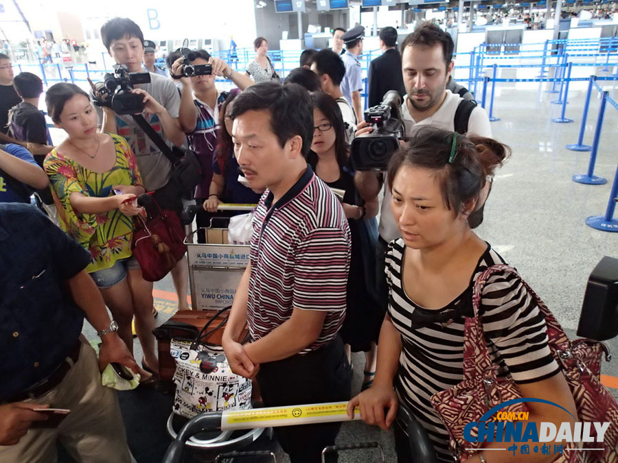 7月8日,在韓亞航空舊金山墜機事故中罹難的中國乘客王琳佳的父親(中)和母親(右)在上海浦東機場等候辦理乘機手續(xù)。(高爾強 攝)