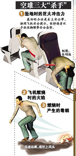 所謂飛機的“黑色10分鐘”,是指絕大多數(shù)空難都發(fā)生在飛機起飛階段的3分鐘與著落階段的7分鐘。但事故一旦發(fā)生,留給機上旅客的逃生時間遠沒有3分鐘、7分鐘這么長。業(yè)內(nèi)人士認為,失事后一分半鐘內(nèi)是逃生的“黃金時間”。此時無論是一個常識的錯誤或是設(shè)備使用的不熟練都足以致命。