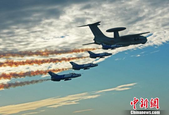 國(guó)產(chǎn)預(yù)警飛機(jī)經(jīng)過(guò)嚴(yán)格試飛定型后,裝備部隊(duì)并參與執(zhí)行新中國(guó)成立60周年大閱兵任務(wù)。圖為預(yù)警機(jī)和護(hù)衛(wèi)飛機(jī)進(jìn)行飛行編隊(duì)訓(xùn)練。 譚超 攝