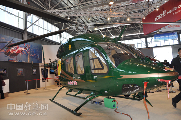 貝爾直升機(jī)公司展臺(tái)的直升機(jī) 中國經(jīng)濟(jì)網(wǎng)記者 段丹峰 攝