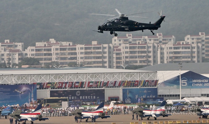 我國自主研制生產(chǎn)的武直-10武裝直升機亮相在珠海舉行的第九屆中國國際航空航天博覽會,在飛行表演中展示了這款直升機的優(yōu)良性能。