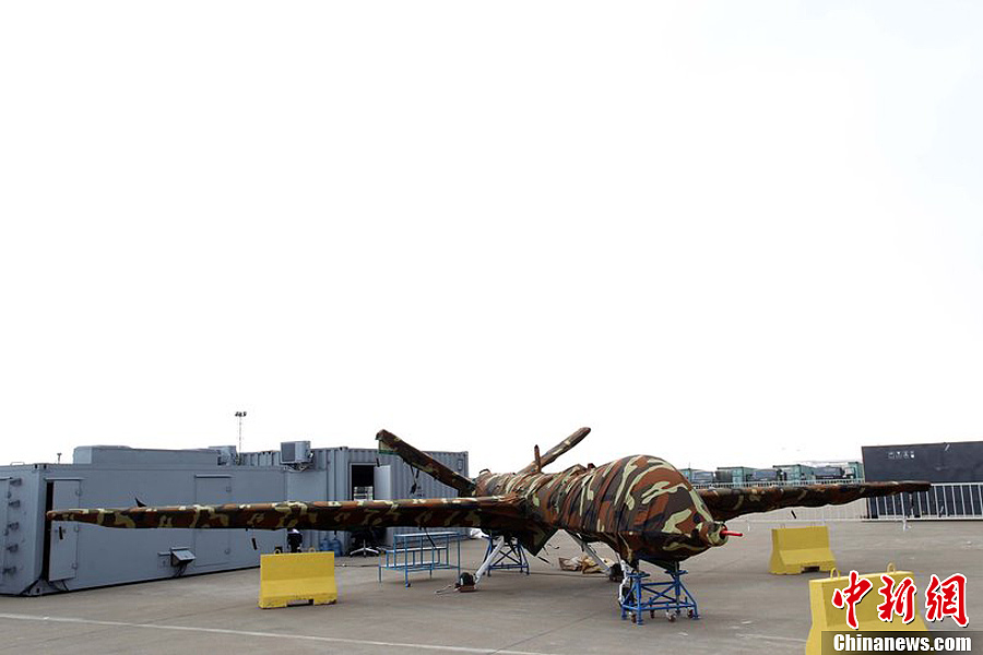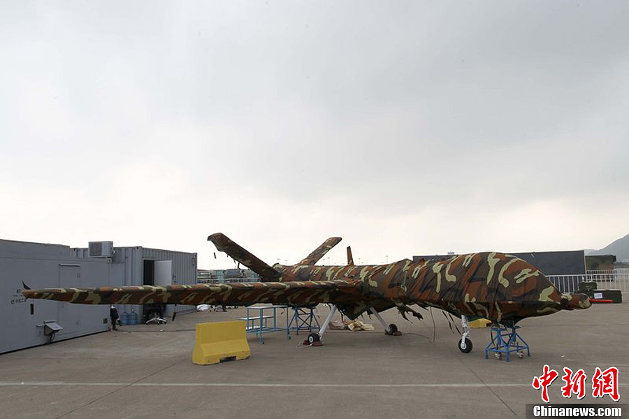 曾在前兩屆珠海航展上展出模型的翼龍無(wú)人機(jī),在今年航展上以實(shí)物參展。11月8日,該機(jī)已經(jīng)組裝完畢停放在展坪上。該款無(wú)人機(jī)由中航工業(yè)旗下成都飛機(jī)設(shè)計(jì)研究所研制,該機(jī)裝有一臺(tái)100馬力活塞發(fā)動(dòng)機(jī),具備全自主平輪式起降和飛行能力,最大起飛重量達(dá)1100公斤,最大續(xù)航時(shí)間為20個(gè)小時(shí),可攜帶各種偵察、激光照射/測(cè)距、電子對(duì)抗設(shè)備及小型空地打擊武器,可執(zhí)行監(jiān)視、偵查及對(duì)地攻擊任務(wù)等任務(wù),也可用于維穩(wěn)、反恐、邊界巡邏等。