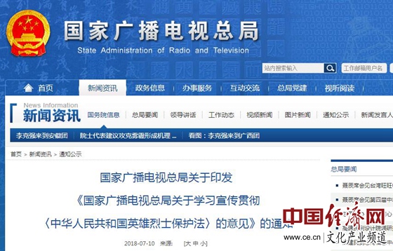 經(jīng)濟日報-中國經(jīng)濟網(wǎng)北京7月11日訊 近日,國家廣播電視總局印發(fā)《國家廣播電視總局關于學習宣傳貫徹〈中華人民共和國英雄烈士保護法〉的意見》(以下簡稱《意見》)的通知?!兑庖姟分赋觯汗膭詈椭С謴V播電視播出機構、信息網(wǎng)絡視聽節(jié)目服務單位、廣播電視節(jié)目制作經(jīng)營機構等創(chuàng)作以英雄烈士事跡為題材、弘揚英雄烈士精神的專題片、紀錄片、訪談節(jié)目、綜藝節(jié)目、電視劇、網(wǎng)絡視聽節(jié)目等;鼓勵英雄烈士題材的劇目積極申報電視劇選題規(guī)劃、網(wǎng)絡原創(chuàng)視聽節(jié)目規(guī)劃。
