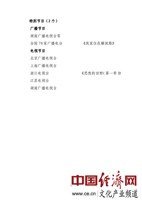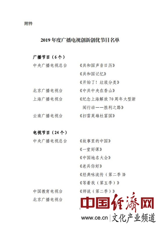 經(jīng)評議,國家廣播電視總局確定中央廣播電視總臺《共和國聲音日歷》、北京廣播電視臺《中共中央在香山》等6個廣播節(jié)目,中央廣播電視總臺《故事里的中國》《中國地名大會》、上海廣播電視臺《這就是中國》、江蘇電視臺《從地球出發(fā)》等24個電視節(jié)目為“2019年度廣播電視創(chuàng)新創(chuàng)優(yōu)節(jié)目”,每個節(jié)目給予5萬元的資金扶持;確定《我家住在解放路》《思想的田野》2個集體創(chuàng)作的節(jié)目為“2019年度廣播電視創(chuàng)新創(chuàng)優(yōu)特別節(jié)目”。