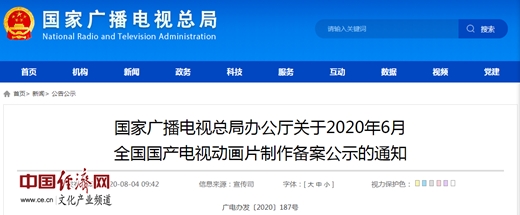 經(jīng)濟(jì)日報(bào)-中國經(jīng)濟(jì)網(wǎng)北京8月5日訊 中國經(jīng)濟(jì)網(wǎng)文化產(chǎn)業(yè)頻道記者從國家廣播電視總局官網(wǎng)獲悉,《國家廣播電視總局辦公廳關(guān)于2020年6月全國國產(chǎn)電視動(dòng)畫片制作備案公示的通知》(簡稱《通知》)于4日發(fā)布?!锻ㄖ访鞔_,2020年6月,經(jīng)備案公示的全國國產(chǎn)電視動(dòng)畫片為53部,19934分鐘。