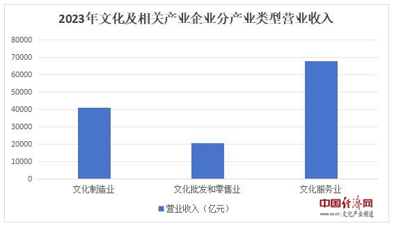 分產(chǎn)業(yè)類型看,文化制造業(yè)實現(xiàn)營業(yè)收入40962億元,比上年增長0.6%;文化批發(fā)和零售業(yè)20814億元,增長6.1%;文化服務業(yè)67739億元,增長14.1%。