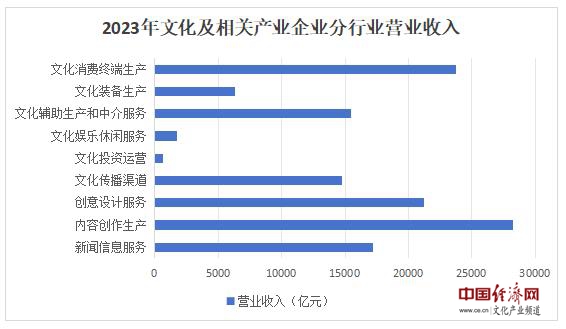 分行業(yè)類別看,新聞信息服務實現(xiàn)營業(yè)收入17243億元,比上年增長15.5%;內(nèi)容創(chuàng)作生產(chǎn)28262億元,增長10.7%;創(chuàng)意設計服務21249億元,增長8.7%;文化傳播渠道14797億元,增長11.9%;文化投資運營669億元,增長24.4%;文化娛樂休閑服務1758億元,增長63.2%;文化輔助生產(chǎn)和中介服務15468億元,增長0.4%;文化裝備生產(chǎn)6282億元,下降2.6%;文化消費終端生產(chǎn)23787億元,增長3.3%。