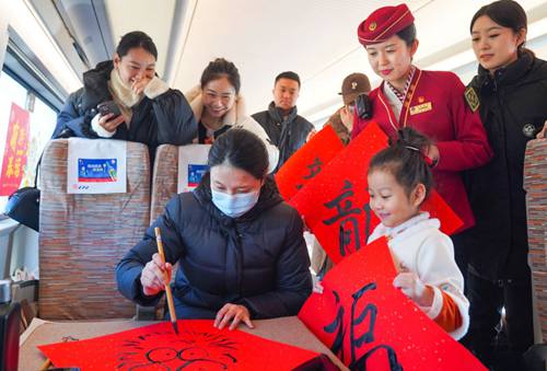 津興城際G8844次列車(chē)上,旅客現(xiàn)場(chǎng)手寫(xiě)書(shū)法福字、畫(huà)龍頭。(中國(guó)鐵路北京局集團(tuán)有限公司供圖)