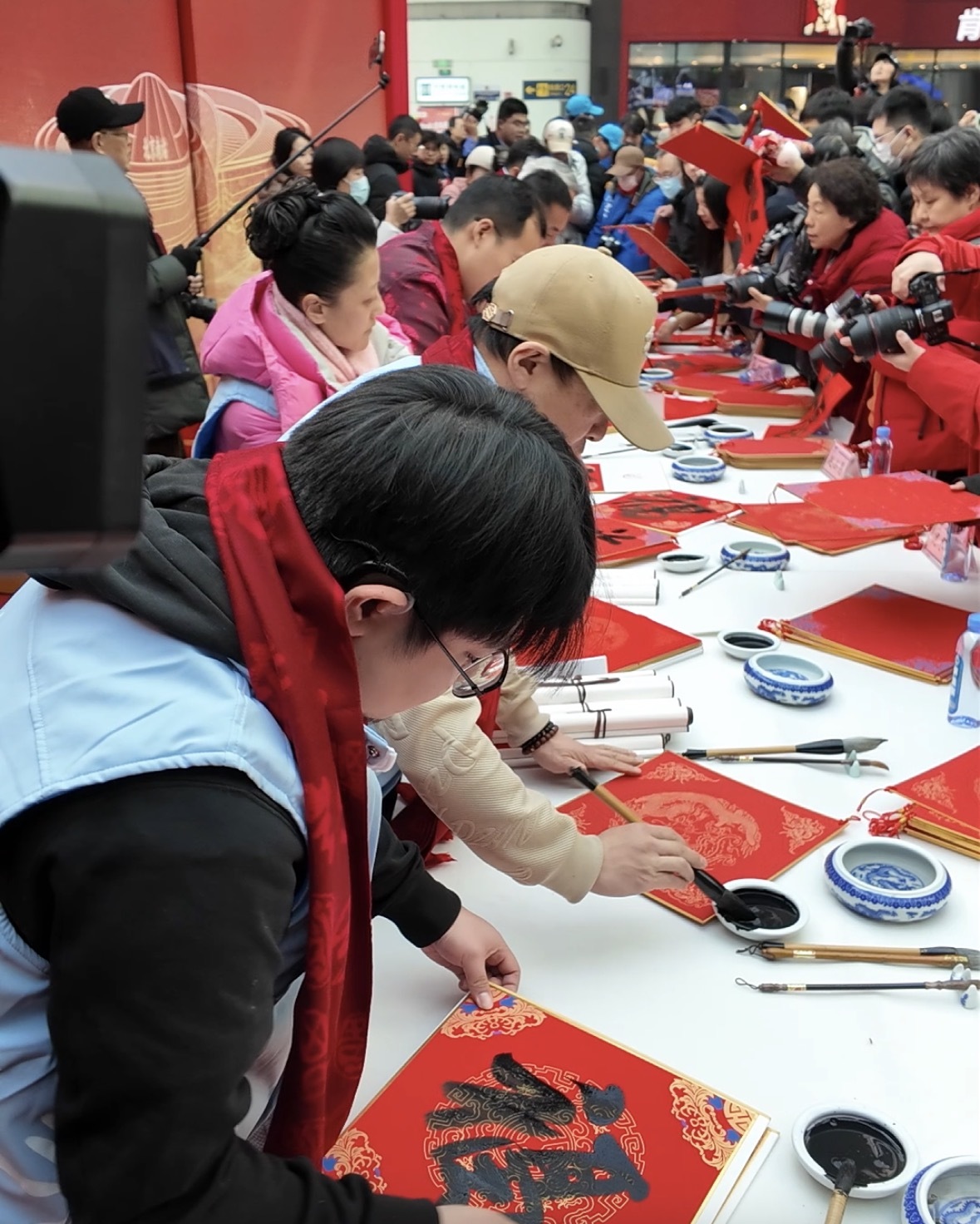 “旅途賀新春、溫暖回家路”春運(yùn)送溫暖文明實(shí)踐活動(dòng)在北京南站候車大廳上演。書法家們?yōu)槁每蜁鴮懜W?。中?guó)經(jīng)濟(jì)網(wǎng)記者鞠然/攝