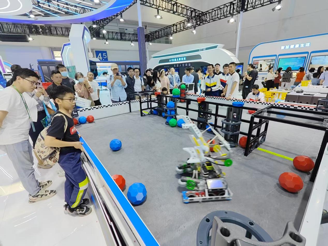 機器人籃球賽激烈開賽,吸引“球迷”朋友們駐足觀賽。 中國經(jīng)濟網(wǎng)記者梁木攝