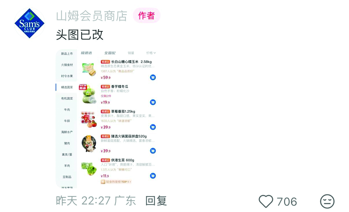 “本次APP的改動于今年8月底開始上線進行測試,并在期間持續(xù)根據(jù)會員的反饋進行優(yōu)化。這兩天我們陸續(xù)收到了更多來自會員關于商品圖片等方面的寶貴建議,我們將會持續(xù)改進,以更好地展現(xiàn)商品的真實形態(tài)并提升體驗。我們始終珍視會員的聲音,歡迎大家在‘山姆APP—我的—用戶調研—商品詳情頁調研’持續(xù)給予反饋。感謝大家的支持。”除此之外,山姆還在評論區(qū)配圖稱:“頭圖已改?!?/p>