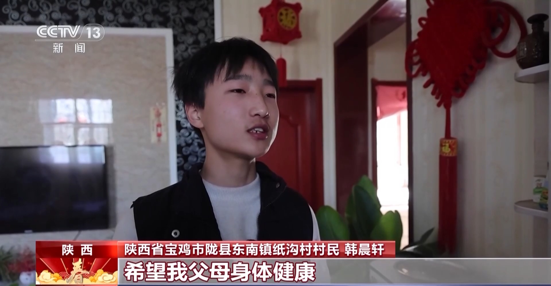 陜西省寶雞市隴縣東南鎮(zhèn)紙溝村村民 韓晨軒:我今年披紅,希望我父母身體健康,希望我哥工作順利,希望我考上好高中。