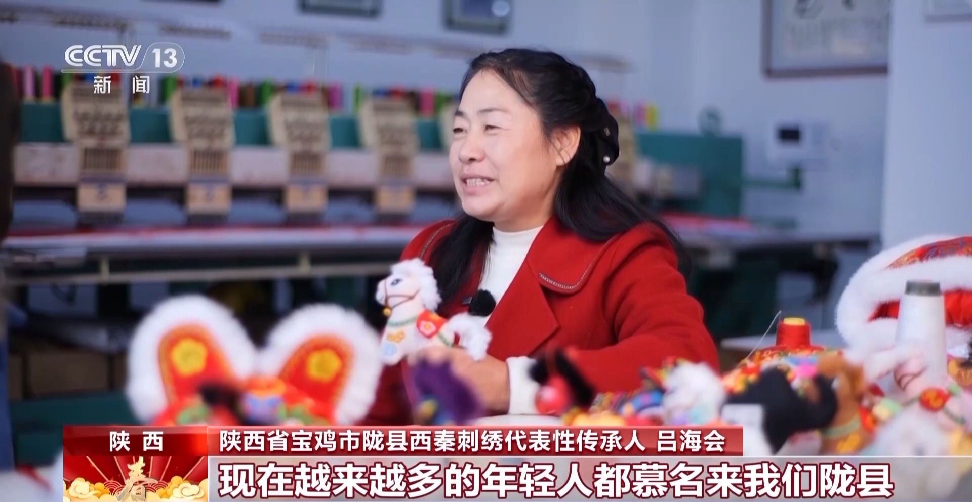 陜西省寶雞市隴縣西秦刺繡代表性傳承人 呂海會(huì):現(xiàn)在越來(lái)越多年輕人都慕名來(lái)我們隴縣看馬社火,也讓更多的人了解到西秦刺繡、喜歡西秦刺繡。我們?cè)诩议T(mén)口傳播手工布藝的同時(shí),也讓大家得到一份收入,心里非常開(kāi)心。