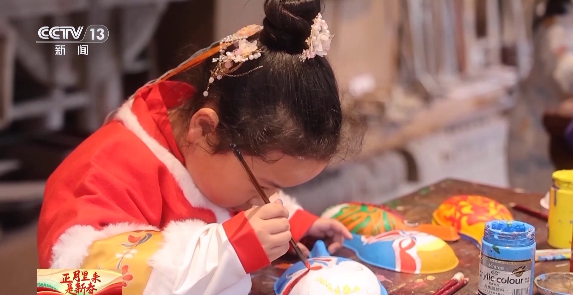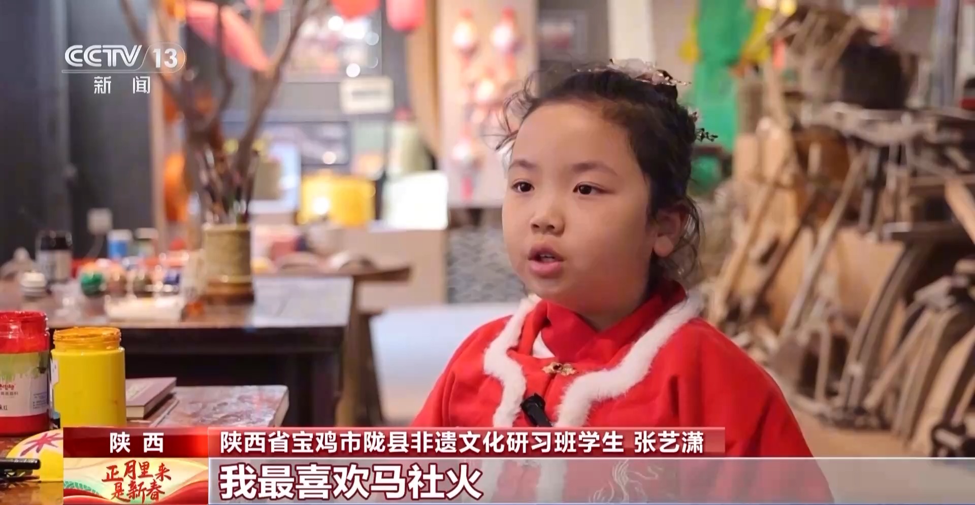 陜西省寶雞市隴縣非遺文化研習(xí)班學(xué)生 張藝瀟:我最喜歡馬社火,因?yàn)榉浅M洌医裉爝€畫(huà)了社火臉譜。