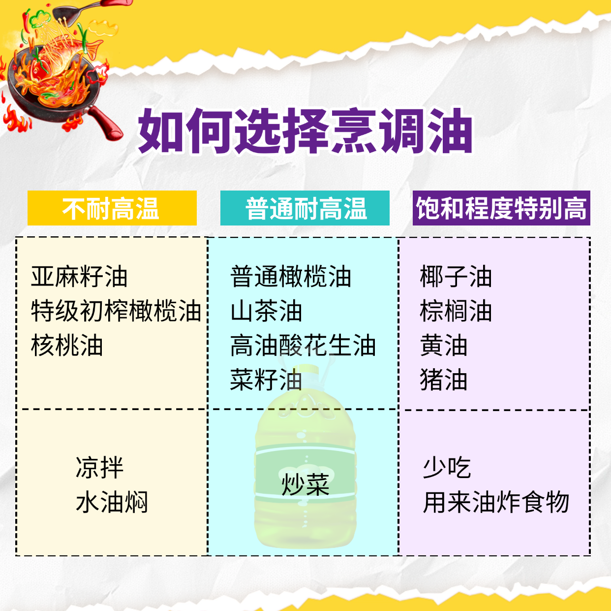 市面上的烹調(diào)油多種多樣,該如何選擇?曹展表示,不耐高溫的烹調(diào)油,如亞麻籽油、特級(jí)初榨橄欖油、核桃油等,可以用來(lái)涼拌、水油燜;普通耐高溫的烹調(diào)油,如普通橄欖油、山茶油、高油酸花生油、菜籽油等,可以用來(lái)炒菜;飽和程度特別高的烹調(diào)油,如椰子油、棕櫚油、黃油、豬油等,首先要少吃,如果有需要,可以偶爾用來(lái)油炸食物。