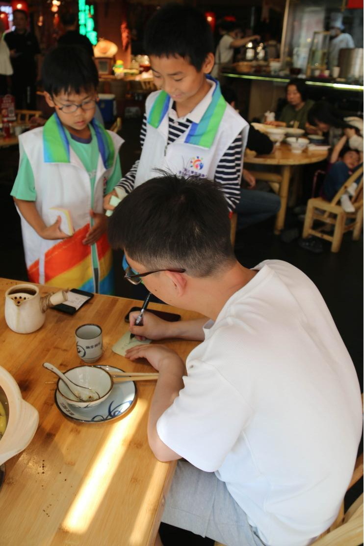 在實踐環(huán)節(jié),志愿者們學以致用,化身“制止餐飲浪費”宣傳員,向餐廳中的食客宣傳節(jié)糧反浪費知識,發(fā)放節(jié)糧知識宣傳單,邀請食客寫下節(jié)約糧食和避免浪費的心得,將“一起來光盤”的節(jié)約理念傳遞給餐廳的消費者。