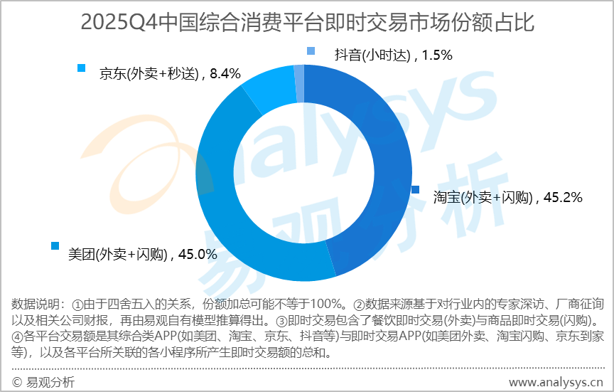 3月14日,第三方研究機構(gòu)易觀分析發(fā)布即時零售市場報告顯示,2025年第四季度淘寶閃購即時交易市場份額為45.2%,美團為45.0%,兩者份額差距僅 0.2個百分點,即時零售市場呈現(xiàn)多平臺競爭態(tài)勢;京東即時交易市場份額為8.4%,位列第三。
