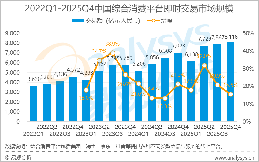 報告顯示,2025年中國綜合消費平臺即時交易市場規(guī)模達到 29852億元,同比增長21.4%;其中2025年第四季度市場規(guī)模為 8118億元,同比增長15.6%,行業(yè)整體保持較快增長。報告分析認為,2025年第四季度,盡管進入秋冬季后飲料等外賣需求有所回落,但隨著“雙11”購物季的到來,促銷熱潮從傳統(tǒng)電商延伸至即時交易場景,支撐了整體市場規(guī)模維持在較高水平。