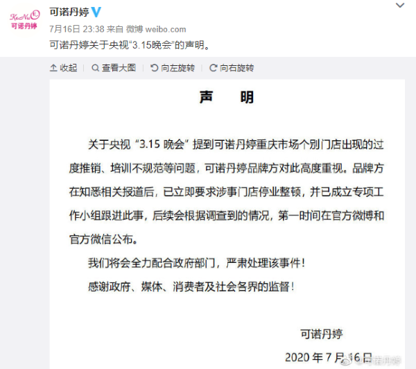 昨日晚間,可諾丹婷針對 315 晚會報(bào)道作出回應(yīng)??芍Z丹婷表示,關(guān)于央視“3.15晚會”提到可諾丹婷重慶市場個(gè)別門店出現(xiàn)的過度推銷、培訓(xùn)不規(guī)范等問題,可諾丹婷品牌方對此高度重視。品牌方在知悉相關(guān)報(bào)道后,已立即要求涉事門店停業(yè)整頓,并已成立專項(xiàng)工作小組跟進(jìn)此事,后續(xù)會根據(jù)調(diào)查到的情況,第一時(shí)間在官方微博和官方微信公布。