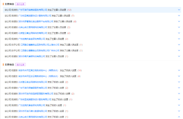 值得注意的是,天眼查顯示,近年來,江西登云健康美業(yè)互聯(lián)有限公司多名股東企業(yè)及多家投資企業(yè)主要人員變動頻繁。如,2016年以來,該公司投資的廣東可諾丹婷美容服務(wù)有限公司發(fā)生主要人員變更累計(jì)12次;該公司的股東吉安市井開區(qū)美云商務(wù)咨詢中心(有限合伙)發(fā)生投資人變更累計(jì)10次。