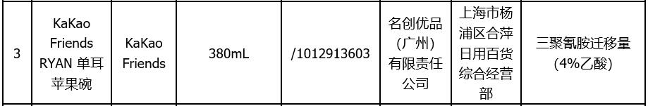 今年6月,上海市市場(chǎng)監(jiān)管局網(wǎng)站發(fā)布的《2019年上海市兒童用餐具(密胺餐具)質(zhì)量監(jiān)督抽查結(jié)果》顯示,標(biāo)稱名創(chuàng)優(yōu)品(廣州)有限責(zé)任公司生產(chǎn)的標(biāo)稱KaKao Friends RYAN 單耳蘋果碗(規(guī)格型號(hào):380mL)被檢出三聚氰胺遷移量(4%乙酸)項(xiàng)目不合格。