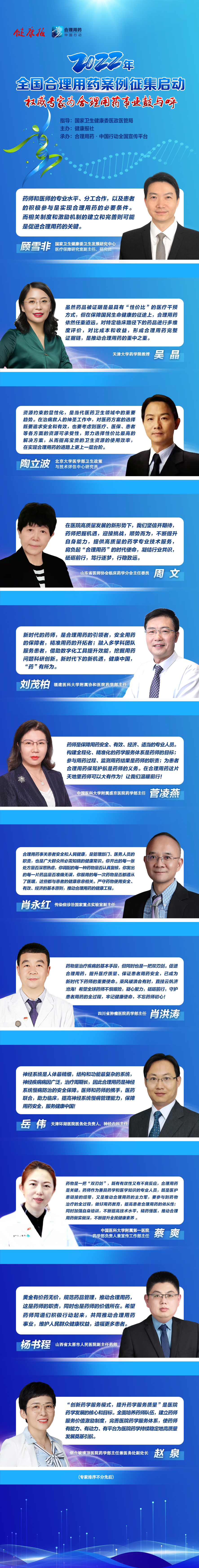 全國權(quán)威醫(yī)藥專家寄語合理用藥事業(yè),齊聚征集啟動時刻,歡迎各地衛(wèi)生健康行政主管部門和醫(yī)療機(jī)構(gòu)積極報送案例。