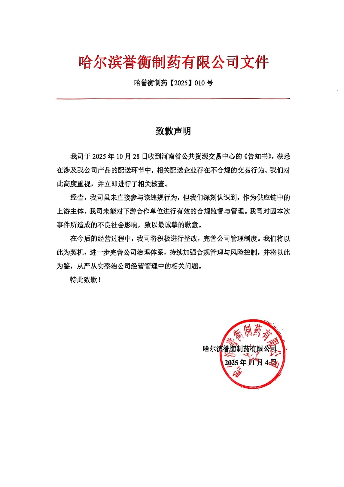 中國經(jīng)濟(jì)網(wǎng)12月22日訊 日前,河南省醫(yī)藥集中采購平臺(tái)在其官網(wǎng)公示了三份藥企公開致歉信。哈爾濱譽(yù)衡制藥有限公司、吉林四環(huán)制藥有限公司、珠海經(jīng)濟(jì)特區(qū)粵康醫(yī)藥有限公司分別就各自涉及的不合規(guī)交易行為公開致歉。