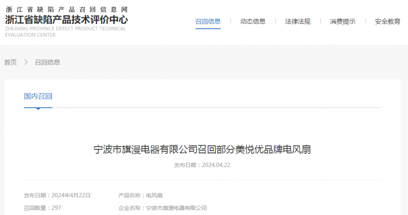 目前,寧波市旗漫電器有限公司受缺陷調(diào)查影響按照《消費品召回管理暫行規(guī)定》的要求,主動向浙江省市場監(jiān)督管理局和寧波市市場監(jiān)督管理局報告了召回計劃,將自即日起,召回2023年5月22日至25日期間制造的部分美悅優(yōu)品牌型號QM-LD001電風(fēng)扇(循環(huán)扇),涉及數(shù)量297臺。