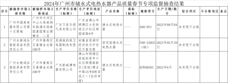 近日,廣州市市場監(jiān)督管理局對儲水式電熱水器產(chǎn)品質(zhì)量進(jìn)行了專項監(jiān)督抽查,共抽查了3批次樣品,經(jīng)檢驗,未發(fā)現(xiàn)不合格。