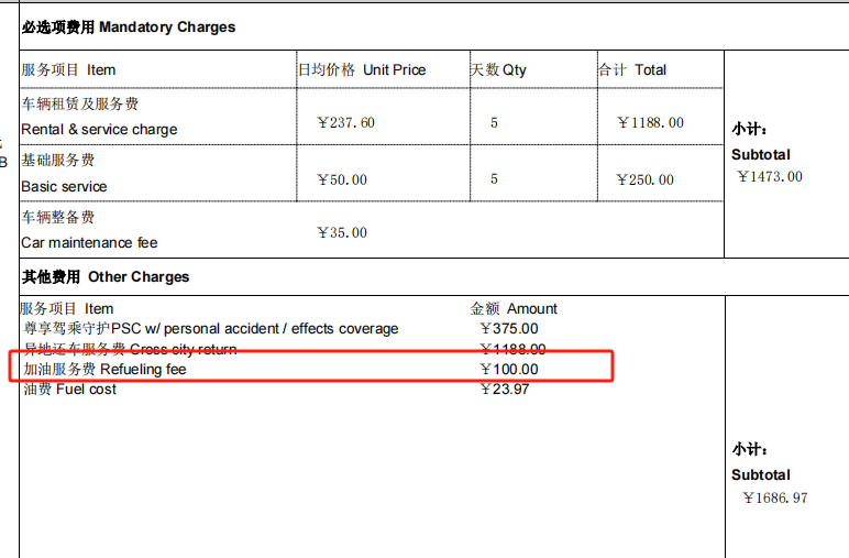 后來,趙女士仔細查看神州租車的賬單,發(fā)現(xiàn)自己竟額外支付了123.97元。其中,23.97元為油費,100元是此前從未見過的“加油服務(wù)費”,趙女士立即聯(lián)系線上客服詢問。