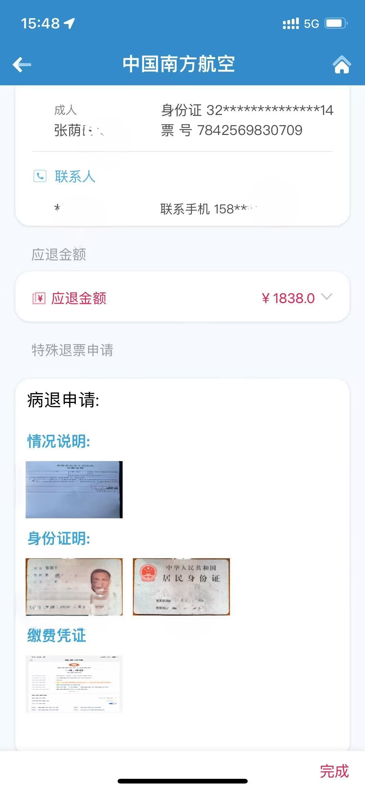 通過南航APP提交病退材料,只退回1838元。 消費(fèi)者張先生供圖