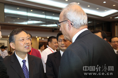 由中國道路交通安全協(xié)會、中國汽車技術(shù)研究中心和中國經(jīng)濟(jì)網(wǎng)共同主辦的“2013中國道路交通安全論壇”于8月29日在北京首都大酒店舉行。圖為公安部副部長黃明與國際道路交通安全協(xié)會主席高斯進(jìn)行交流。中國經(jīng)濟(jì)網(wǎng) 郝紅波 攝影
