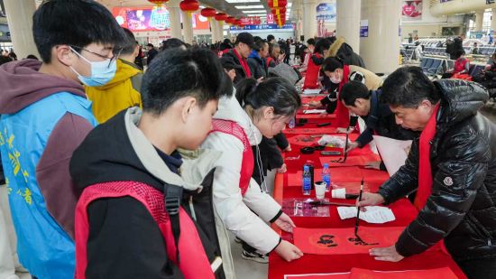 文化展示區(qū)里,傳統(tǒng)韻味與暖心服務(wù)交織成獨(dú)特風(fēng)景。鐵路部門(mén)、大連車(chē)站派出所、大連市慈善總會(huì)、大連青年書(shū)協(xié)的書(shū)法愛(ài)好者們揮毫潑墨,一幅幅春聯(lián)、一個(gè)個(gè)福字飽含美好祝愿,免費(fèi)送到旅客手中;紅包拓印體驗(yàn)更讓大家親手解鎖新春儀式感,沉浸式感受傳統(tǒng)年俗的魅力。大連北站的非遺展示區(qū)人氣爆棚:剪紙藝人指尖生花,一張張馬年主題剪紙惟妙惟肖;吹糖人、面塑攤位前,孩子們圍攏觀望,老師傅們巧手翻飛,將滾燙的糖漿、柔軟的面團(tuán)化作形態(tài)各異的小動(dòng)物,引得陣陣歡呼;五谷畫(huà)展臺(tái)則以各色谷物為料,勾勒出寓意吉祥的新春圖景,讓旅客直觀感受傳統(tǒng)技藝的匠心與溫度。
