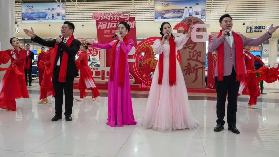 上午8時(shí)30分,大連北站候車(chē)大廳早已客流涌動(dòng),大連市總工會(huì)“心連心”藝術(shù)團(tuán)的歌舞《把福帶回家》率先登場(chǎng),歡快的旋律瞬間點(diǎn)燃現(xiàn)場(chǎng)氣氛。男聲獨(dú)唱《西部放歌》、《咱老百姓》婉轉(zhuǎn)悠揚(yáng),女聲二重唱《珊瑚頌》娓娓動(dòng)聽(tīng),最后一曲歌伴舞《走進(jìn)春天》大合唱引發(fā)全場(chǎng)共鳴,旅客們紛紛駐足鼓掌,用掌聲回應(yīng)這份冬日里的熱忱。與此同時(shí),互動(dòng)區(qū)域已熱鬧開(kāi)鑼?zhuān)耙获R當(dāng)先,把福帶走”活動(dòng)臺(tái)前,車(chē)站工作人員和青年志愿者引導(dǎo)旅客掃碼關(guān)注“濱城老鐵”賬號(hào),領(lǐng)取馬年限定蓋章本,打卡拍照墻“我在大連,馬上就回家”的路標(biāo)文案,道出了無(wú)數(shù)游子的心聲。