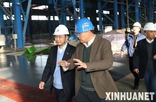在一重新建成的重型加工熱處理車間,吳生富(戴藍帽者)向來訪的中廣核工程公司總經(jīng)理束國剛一行介紹一重在制核電產(chǎn)品情況(2009年10月28日攝)。新華社發(fā)(陳建軍攝)
